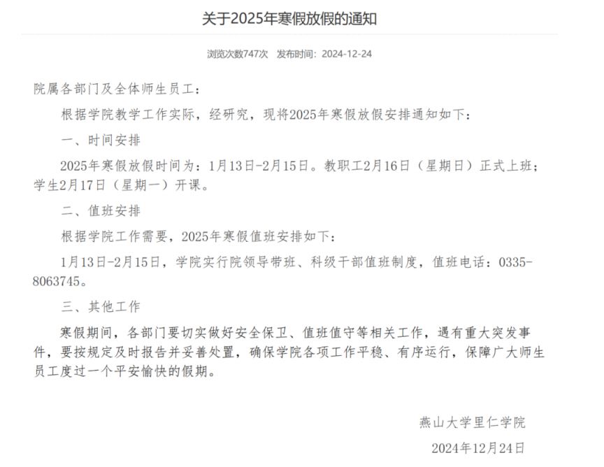 燕山大学里仁学院放假时间: