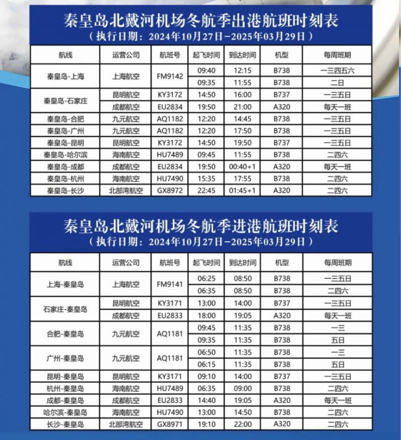 2025年秦皇岛市北戴河机场秋冬季航班时刻表