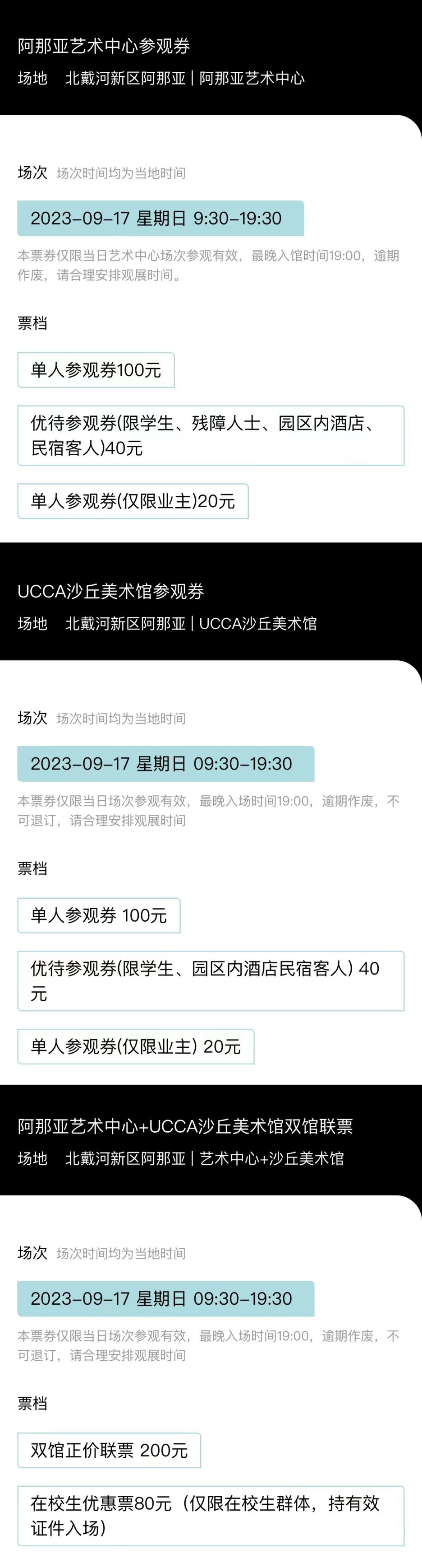周五周六、节假日、旺季购买联票(阿那亚艺术中心+沙丘美术馆)可凭票步行进入园区(西门或者南二门)