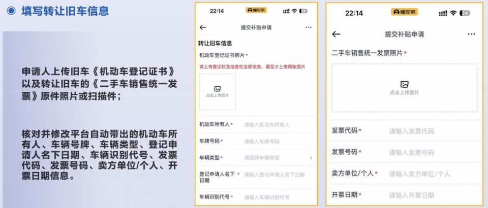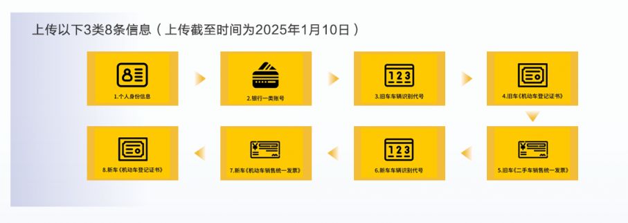 上传流程:个人身份信息 提供银行一类账号 旧车车辆识别代号 旧车(机动车登记证书) 旧车(二手车销售统一发票 ) 新车车辆识别代号 新车《机动车销售统一发票》 新车《机动车登记证书》