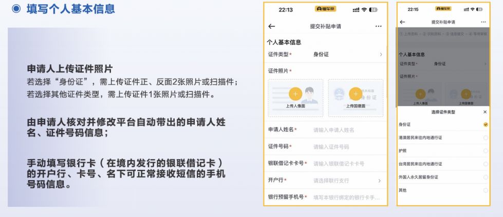 申请人上传证件照片若选择“身份证”,需上传证件正、反面2张照片或扫描件;若选择其他证件类型,需上传证件1张照片或扫描件。由申请人核对并修改平台自动带出的申请人姓名、证件号码信息;手动填写银行卡(在境内发行的银联借记卡)的开户行、卡号、名下可正常接收短信的手机号码信息。
