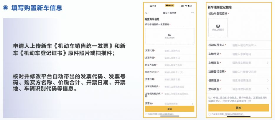 申请人申请人上传新车《机动车销售统一发票》和新车《机动车登记证书》原件照片或扫描件;核对并修改平台自动带出的发票代码、发票号码、购买方名称、价税合计、开票日期、开票地、车辆识别代码等信息。