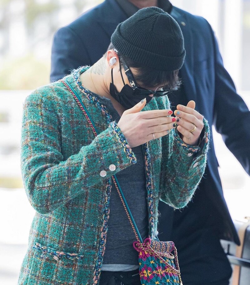 名不虚传,GD每次的香奈儿穿搭总能穿出专属于己的时髦辨识度,以简单的灰黑色打底,GD搭配了一件绿色的斜纹软呢外套,中间穿插着桃红、黄与蓝的格纹点缀。最令人眼睛为之一亮的是,你我还在排队等mini 22的皮革版本,权志龙早已抢先一步背上了新的面料款式,桃红色的皮穿链还刚好与外套的小细节呼应!
